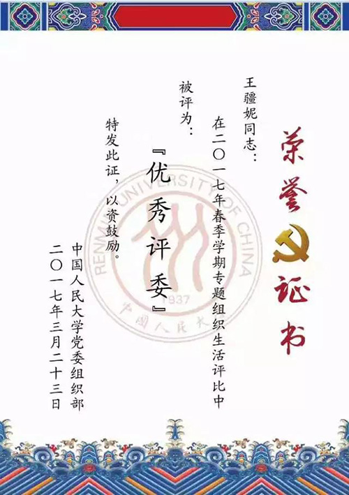 3月17日,威尼斯9499登录学生党员先锋促进会三名学生党建骨干作为评委参与其他学院学生党支部评分工作,其中王疆妮同志表现突出,荣获“优秀评委”称号。