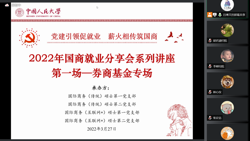 自3月27日起,国际商务(传统)硕士第一党支部、国际商务(传统)硕士第二党支部、国际商务(互联网+)硕士第一党支部与国际商务(互联网+)硕士第二党支部以线上线下相结合的方式举办了以“党建引领促就业,薪火相传筑国商”为主题的党日活动,活动共计三场,分别聚焦于券商基金求职、互联网与民营企业以及银行求职的经验分享。