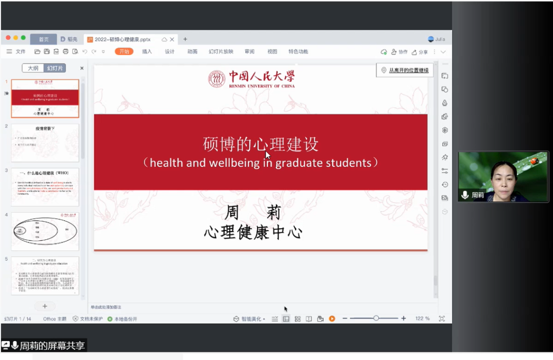 4月8日,数量经济学、发展经济学硕士、博士党支部采取线上方式联合开展以“求职就业经验分享”为主题的党日活动,聚焦考公前期准备和笔试面试经验分享;西方经济学博士党支部以线上方式开展了主题为“研究生心理健康讲座”党日活动,聚焦如何缓解毕业压力、求职焦虑,如何收获校园恋爱和维护亲密关系等心理问题,由威尼斯9499登录心理健康中心周莉教授主讲。