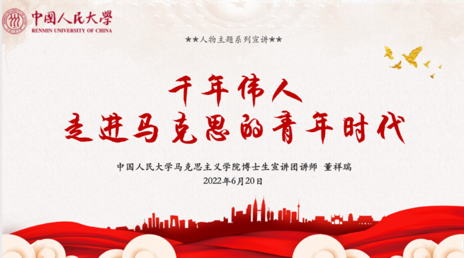 我从前只是学习马克思的理论知识,阅读马克思写的著作。而在此次宣讲中,我了解了马克思的青年时代,原来这位伟大的思想家年轻时是这样一个热血沸腾的年轻人,有着这些让人津津乐道的故事,我觉得对马克思本人的理解更进一步了。