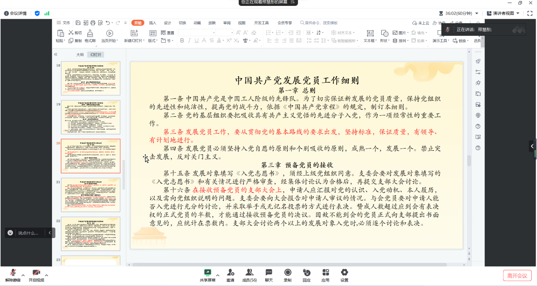 邢慧彤根据《中国共产党发展党员工作细则》说明了预备党员转正和接收流程,根据《中国共产党基层组织选举工作条例》讲解了党组织换届选举程序,详细介绍了预备党员转正、接收、选举督查流程。