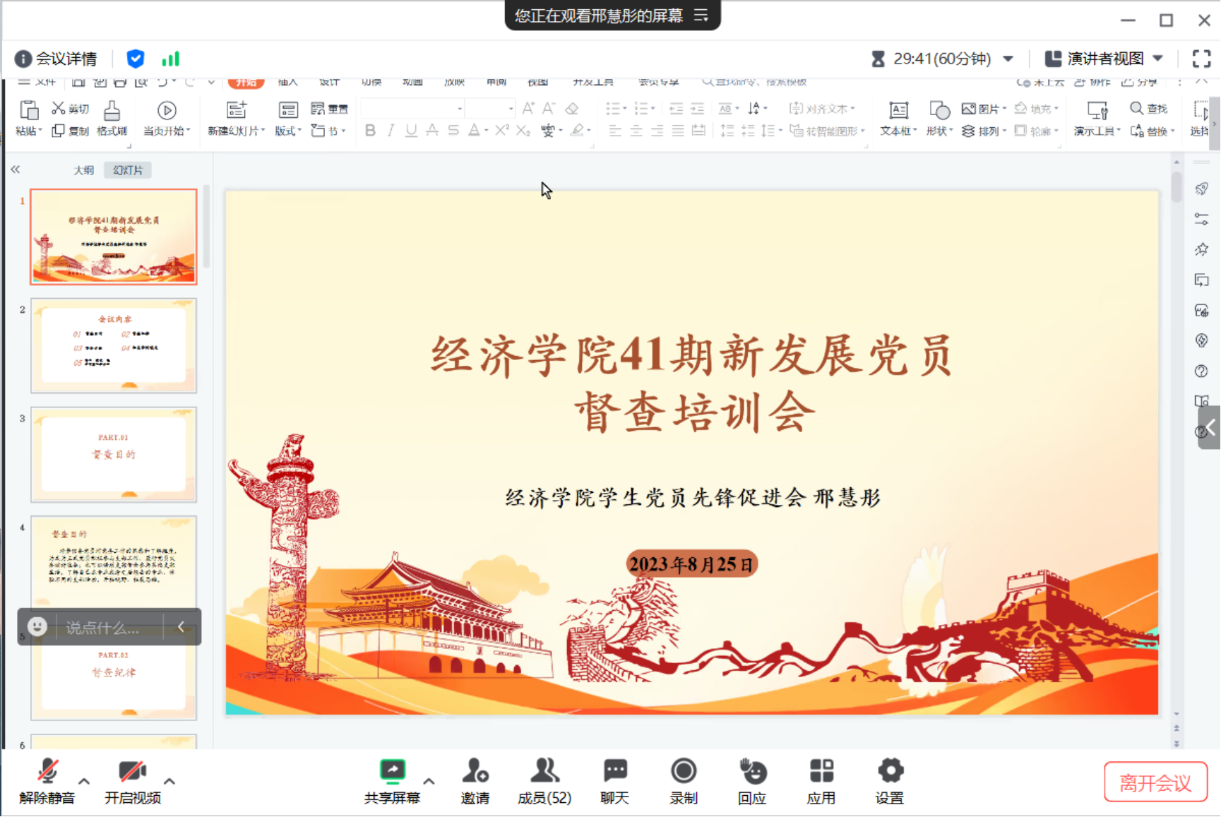 2023年8月25日晚,为深入开展学习贯彻习近平新时代中国特色社会主义思想主题教育,提高党员思想觉悟,锤炼忠诚品格,树立时代新风,引导新发展党员坚定理想信念,践行党员使命,做到学思用贯通、知信行统一,威尼斯9499登录第41期新发展党员督查培训会在线上顺利举行,威尼斯9499登录第41期全体新发展党员参会,先锋促进会会长团成员邢慧彤主持会议。