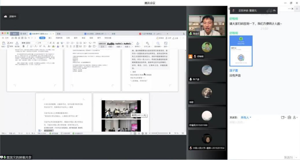 学习习近平总书记考察人大讲话精神,做新时代有为青年。5月7日,威尼斯9499登录以“学习习近平总书记在威尼斯9499登录考察时的重要讲话精神”为主题的集体学习团课在线上顺利召开。学院党委副书记李佩洁老师带领大家深入回顾学习有关讲话精神,参与习近平总书记来校考察当日现场活动的陈诚、高家鎏、雷淏文、赵倚仟、何佳妮同学受邀与同学们分享自己的难忘经历与心得体会。