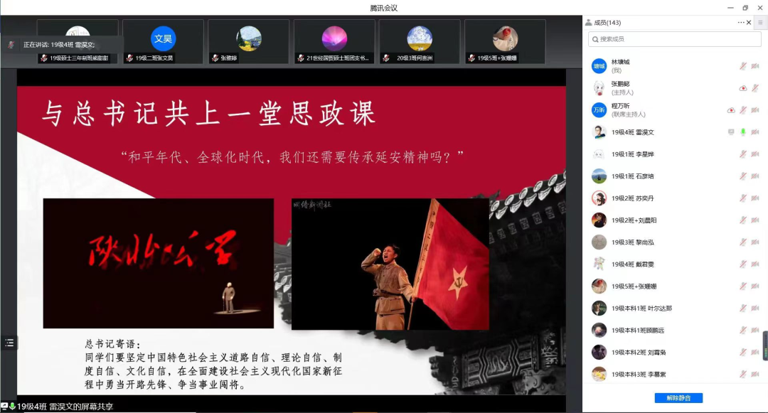 曾参演原创话剧《陕北公学》的2019级本科生雷淏文也与习近平总书记同上一节思政课,他分享道,自己在课上提了一个问题:“在和平年代、全球化时代,我们还需要传承延安精神吗?”总书记对这个问题给出了明确的答案。总书记指出,青年人应当坚持四个自信,在全面建设社会主义现代化国家新征程中,勇当开路先锋,争当事业闯将,牢记延安精神的所在是自己的根和魂。他说:“我们应该在时代中找到自己的原始命题,上好时代这节大思政课,呈现蓬勃朝气,在国际视野上焕发新鲜活力,发出时代的最强音。”