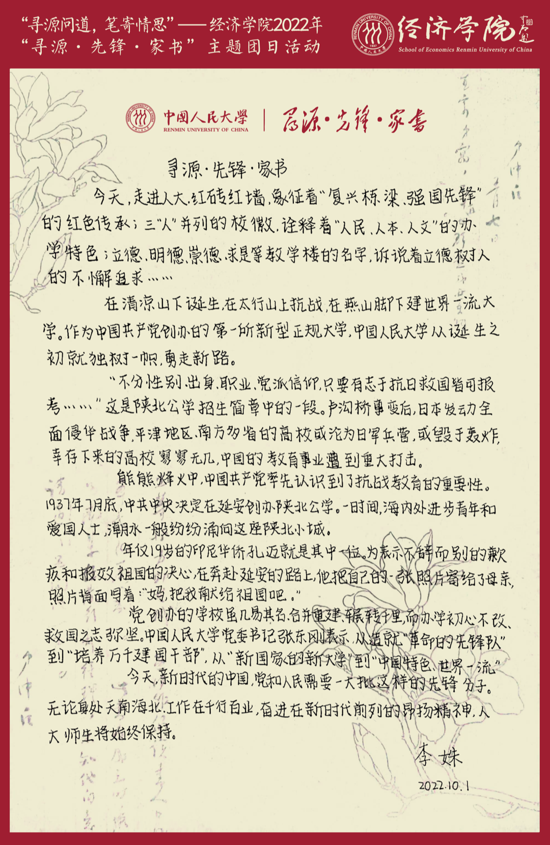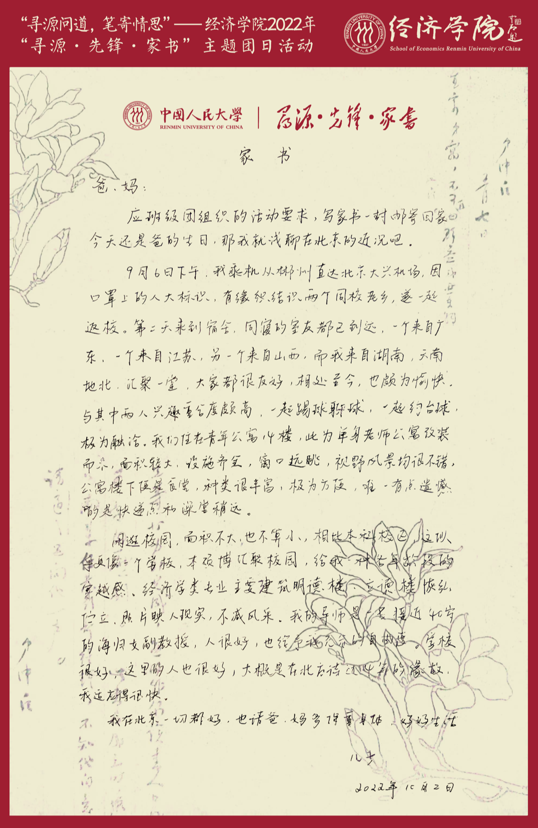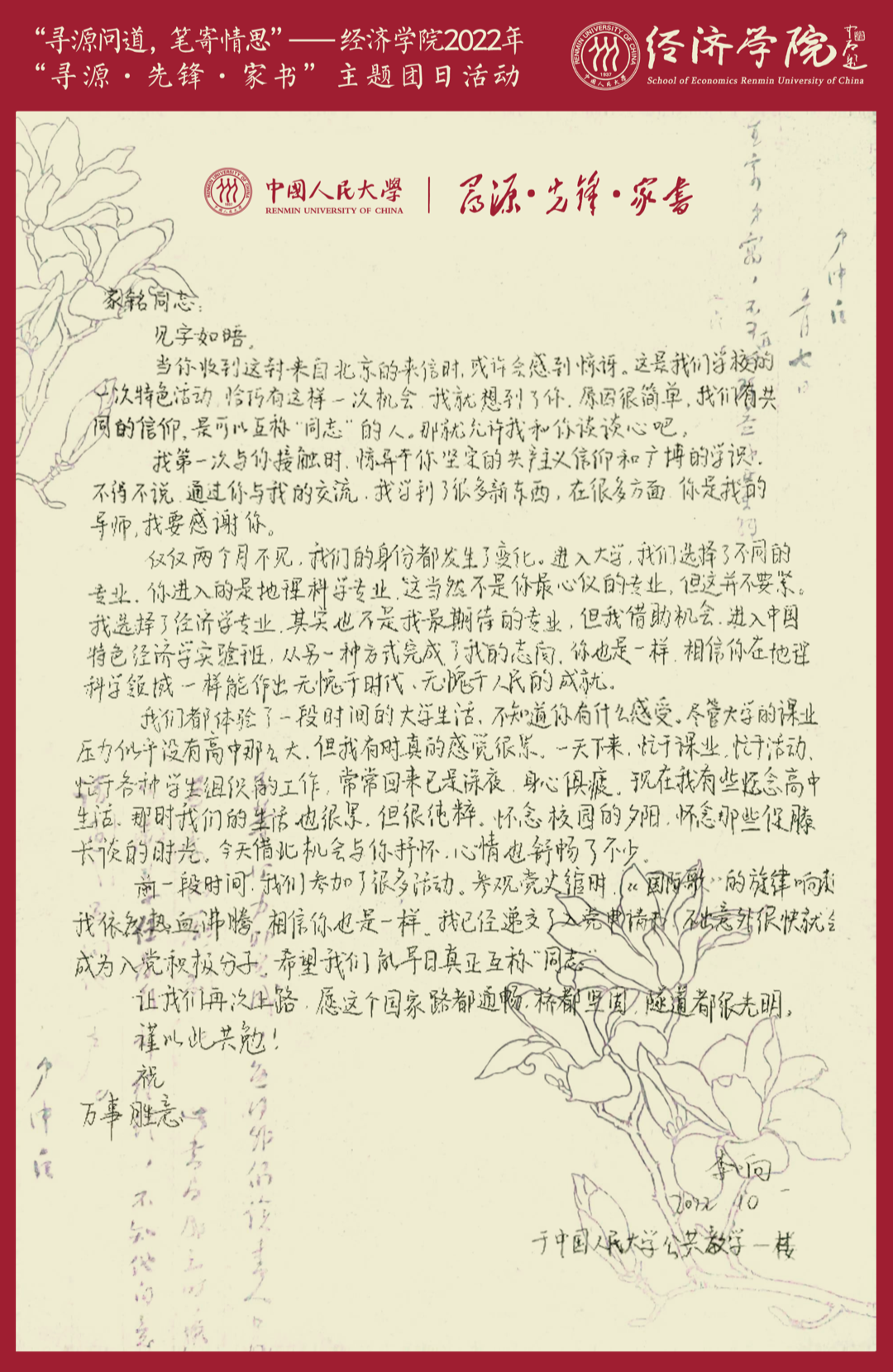 家书是个人志向承托的载体,是与亲友间情感维系的纽带,更是根植于每位中华儿女内心深处的家国情怀。各新生团支部的同学们通过手写“寻源·先锋·家书”,将自己对人大人时代使命的思考付诸笔端。
