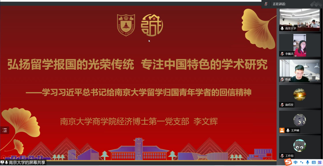 南京大学商学院经济博士第一党支部李文辉同志以“弘扬留学报国的光荣传统,专注中国特色的学术研究,学习习近平总书记给南京大学留学归国青年学者的回信精神”为主题进行了学习分享。李文辉分三个方面进行了介绍,一是留学报国的光荣传统彰显了青年学者的爱国情怀;二是在新发展阶段,需要大力弘扬留学报国的光荣传统;三是做到立足中国大地,专注中国特色的学术研究。
