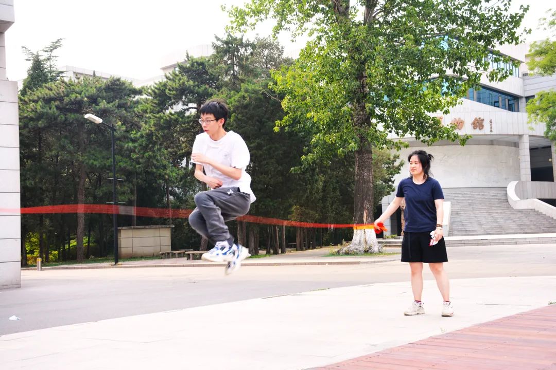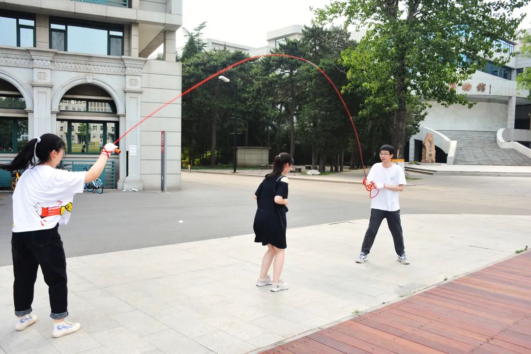 飞盘之外,同学们还玩起了跳长绳、丢沙包、踢毽子。跳绳的同学身轻如燕,一个接一个动作敏捷跳过长绳,这默契的配合让身旁同学惊叹不已。丢沙包更是把全场气氛带入高潮。一人掷出沙包,几人追赶,扑身勇夺,身姿矫健,更显青春风采。
