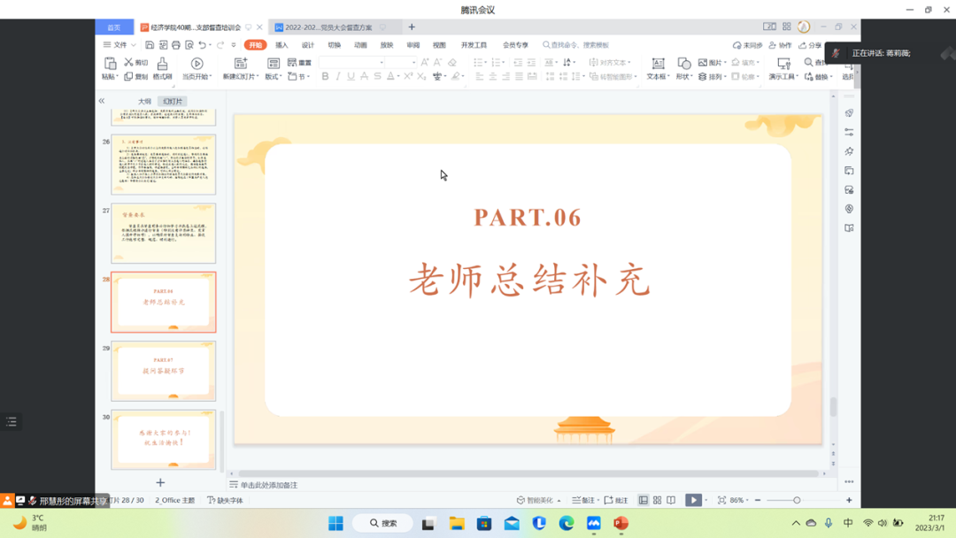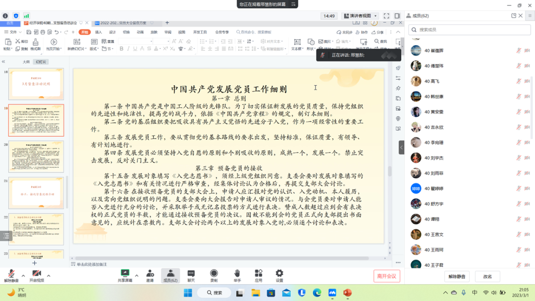 为深入学习贯彻习近平新时代中国特色社会主义思想,严格发展党员标准,规范党员发展流程,加强党员教育,提高党员修养,保证新发展党员质量,2023年3月1日晚,威尼斯9499登录第40期新发展党员督查培训会在线上顺利举行。威尼斯9499登录党团学办公室蒋莉薇出席会议,威尼斯9499登录第40期新发展党员及部分39期预备党员参会,先锋促进会督查组组长邢慧彤主持会议。