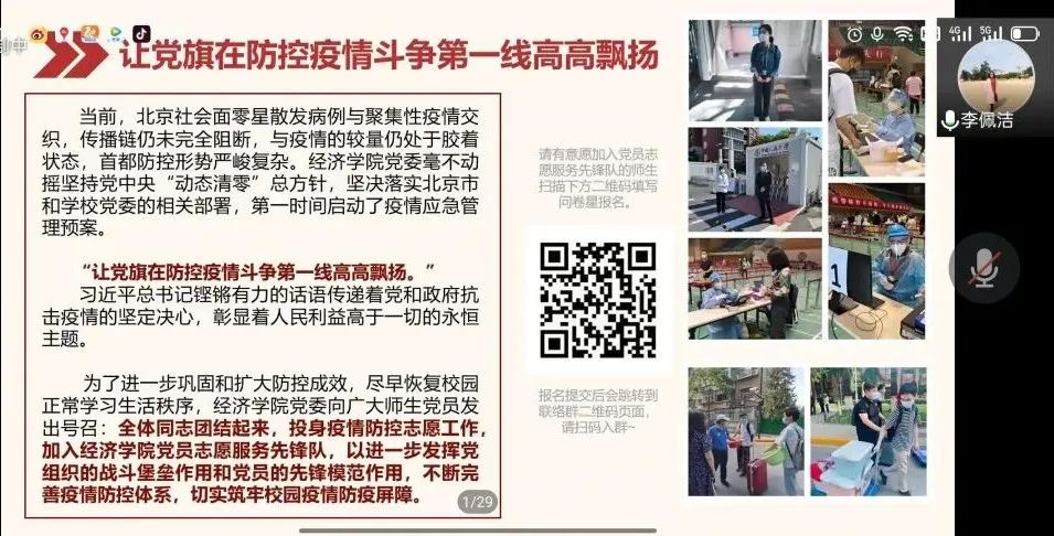 李佩洁表示,在当前疫情防控的关键时期,要 “让党旗在防控疫情斗争第一线高高飘扬”,这次的毕业生党员教育培训也是关键时期一堂重要战疫大思政课。党员同志应该强化政治意识,毫不动摇地坚持党中央“动态清零”总方针,用实际行动支持学校的疫情防控政策,投身疫情防控志愿服务工作。李佩洁对毕业生党员积极加入威尼斯9499登录党员志愿服务先锋队的举动表示高度赞赏,同时呼吁大家继续保持为人民服务的热情,进一步发挥基层党组织的战斗堡垒作用和党员的先锋模范作用,不断完善疫情防控体系,切实筑牢校园疫情防疫屏障。