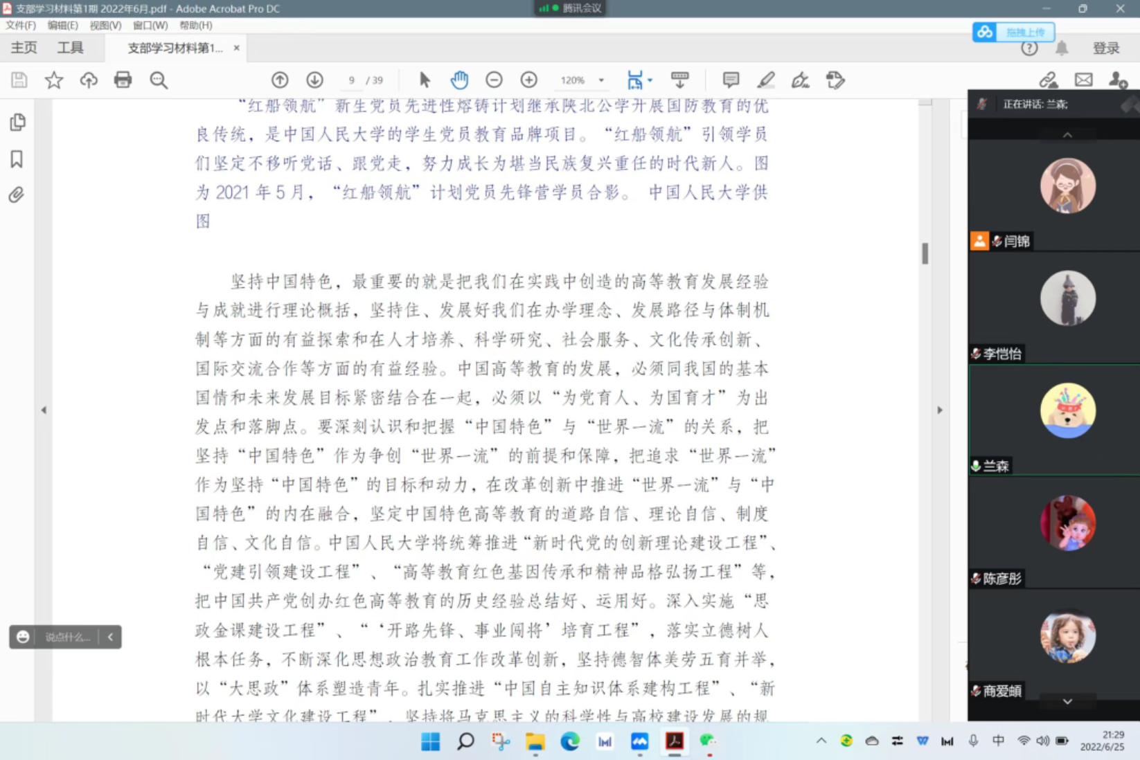6月26日,为深入贯彻习近平总书记在学校考察时重要讲话精神,西方经济学硕士党支部采取线上腾讯会议集体围读的形式对学校党委在2022年第11期《求是》杂志上发表的署名文章《坚定不移走好建设中国特色、世界一流大学新路》进行研读学习。本次活动由西方经济学硕士党支部书记闫锦主持活动,全体支部成员参会。