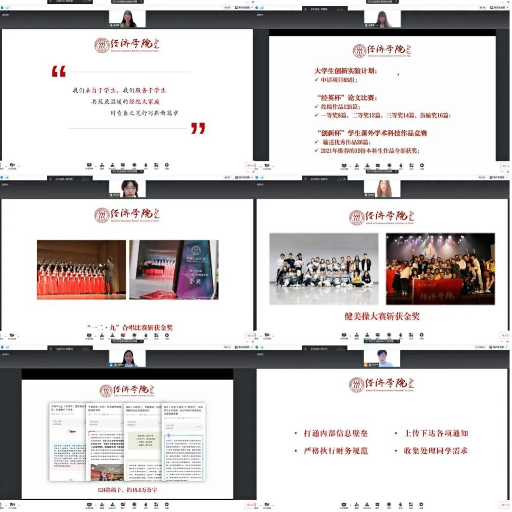 威尼斯9499登录学生会第二十届主席团成员作工作报告。六位成员分别从生活权益、学术实践、文艺工作、体育活动、宣传设计和服务保障六个方面进行汇报,数据与图文并茂,生动展示了过去一年学生会所做的大量扎实、丰富、卓有成效的工作及取得的一系列骄人成绩。经济学院学生会在工作中展现出青春担当,真正履行了学生会思想引领、桥梁纽带、服务成长的职责使命。