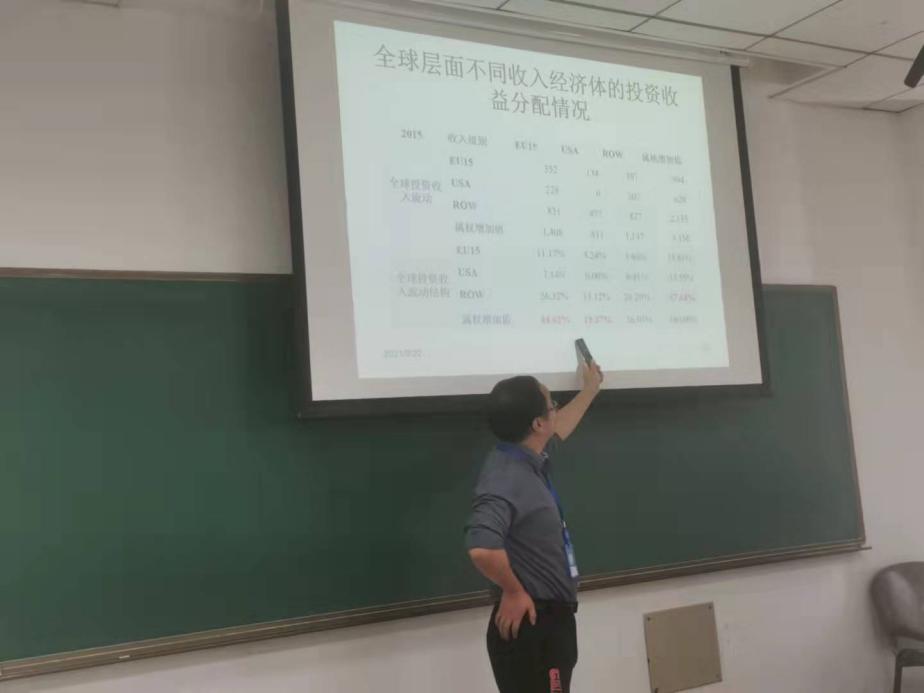 随后,祝教授向现场的老师和学生展示了反映跨国公司的GVC新核算框架研究的几点发现:一是跨国公司跨境投资相关的全球价值链活动(FDI相关GVC)高于贸易相关的全球价值链活动,传统仅考虑贸易的核算框架极大低估了全球价值链规模;二是FDI相关GVC在高收入经济体和高研发行业更为显著,从FDI相关GVC细项来看,跨国公司与本土企业的生产关联是跨国公司全球价值链的主要方式三是在新核算框架下从总体、不同研发强度部门层面对比了中美价值链活动分解结果、GVC参与度FDI相关GVC细项占比等;四是在全球层面分析不同收入经济体的跨境投资收益分配情况,以及考虑跨国公司投资收益后,中美两国贸易和投资收入失衡现象的变化