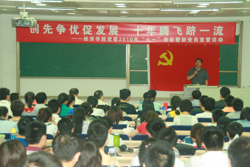 为响应《中共北京市委组织部、中共北京市委宣传部关于在全市党支部和党员中深入开展创先争优活动的实施意见》、北京市教育工作委员会《关于在高校党支部和党员中深入开展创先争优活动的实施方案》、学校党委《威尼斯9499登录关于在全校党支部和党员中深入开展创先争优活动的实施方案》等有关文件的要求,6月18日下午,威尼斯9499登录党委组织开展了以“创先争优促发展,十年腾飞跻一流”为主题的2010年“七一”党员表彰大会暨新党员宣誓活动在明德法学楼0201举行。这次活动的主要目的是表彰学院获得优秀党支部书记和优秀党员称号的老师和同学以及举行新党员的宣誓活动。威尼斯9499登录党委书记张宇教授、党委副书记明占生、丁凯,全体党委委员以及获奖师生出席了本次活动。大会由丁凯副书记主持。