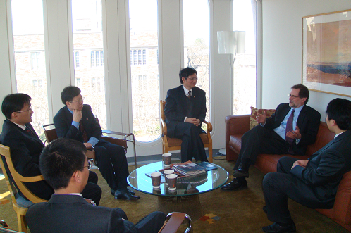 325 ,杨瑞龙院长率团访问了耶鲁大学,会见了该校商学院院长Sharon Oster教授、常务副院长Stanley Garstka教授、经济系主任Christopher Udry教授、商学院陈志武教授以及Keith Chen副教授、Daylian Cain博士、Shane Frederick博士等,就两校在经济学领域开展合作以及合作的具体方式进行了深入交谈。Oster教授希望可以推进两系在管理经济学和公司金融领域开展合作研究。Stanley Garstka教授向代表团赠送了他本人的最新学术著作。杨瑞龙院长向Udry教授赠送了英文版的宏观经济报告,Udry教授表示很感兴趣,并表示愿意促进我校威尼斯9499登录双学位实验班学生到该系攻读博士学位。双方还就制度经济学、发展经济学和企业理论等经济学领域开展合作研究进行了深入讨论。会谈中,杨瑞龙院长还重点介绍了我校开展国际小学期暑期学校的相关情况,他盛情邀请耶鲁大学的专家学者和优秀学子来人民大学参加国际小学期暑期学校项目。访问耶鲁大学期间,在世界著名实验经济学家Shyam Sunder教授的安排下,杨瑞龙院长一行还参观了耶鲁大学经济学实验室,对该校实验室的仪器设备、场地布局、软件开发等事项进行了深入考察和交流,并就联合开展实验研究达成了合作意向。