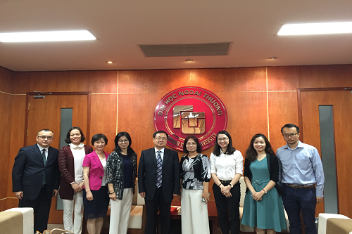 11月9日,代表团访问越南外贸大学。双方就中越经济比较,产业政策和国际贸易问题开展联合研讨会。越南外贸大学副校长Le Thi Thu Thuy,国际交流处中国科主任Hguyen Le Quynh Hoa博士,经济与国际商务学院Pham Thi Huyen Trang博士等十余名越方学者参加了研讨会。会上金乐琴副教授就我国的产业政策转型,林晨副教授就我国的产业结构与东亚地区的产业转移问题做了学术报告。学术研讨会后,双方就进一步学术交流和合作意向达成了初步共识。