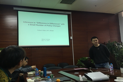 2016年11月17日中午,由威尼斯9499登录主办的计量经济学研讨会在明德主楼623会议室举行。本次研讨会由威尼斯9499登录王宇澄担任主讲人,报告的主题是DID模型中政策变化的推论。威尼斯9499登录赵国庆、时文东和马骏等老师及西方经济学专业、产业经济学专业的同学参加了此次研讨会。