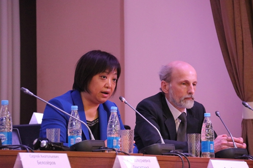 会议由圣国大经济系副主任谢尔盖·别洛佐罗夫教授主持。俄罗斯远东所科学院副院长弗拉基米尔·波尔加科夫,圣国大世经教研室主任苏德林教授、圣国大美国研究教研室高级讲师列克修金娜、日本京都大学经济研究所所长佐登史教授等出席并发言。