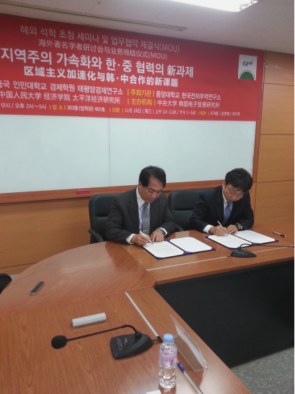 在与中央大学的学者交流后,陈建教授代表威尼斯9499登录太平洋经济研究所与中央大学韩国电子商务研究所所长徐庸原教授共同签署了相互进一步交流合作的意向书,同时与中央大学经济管理学院院长吴永泽和MBA项目执行院长就双方进一步交流合作进行了富有建设性的探讨。