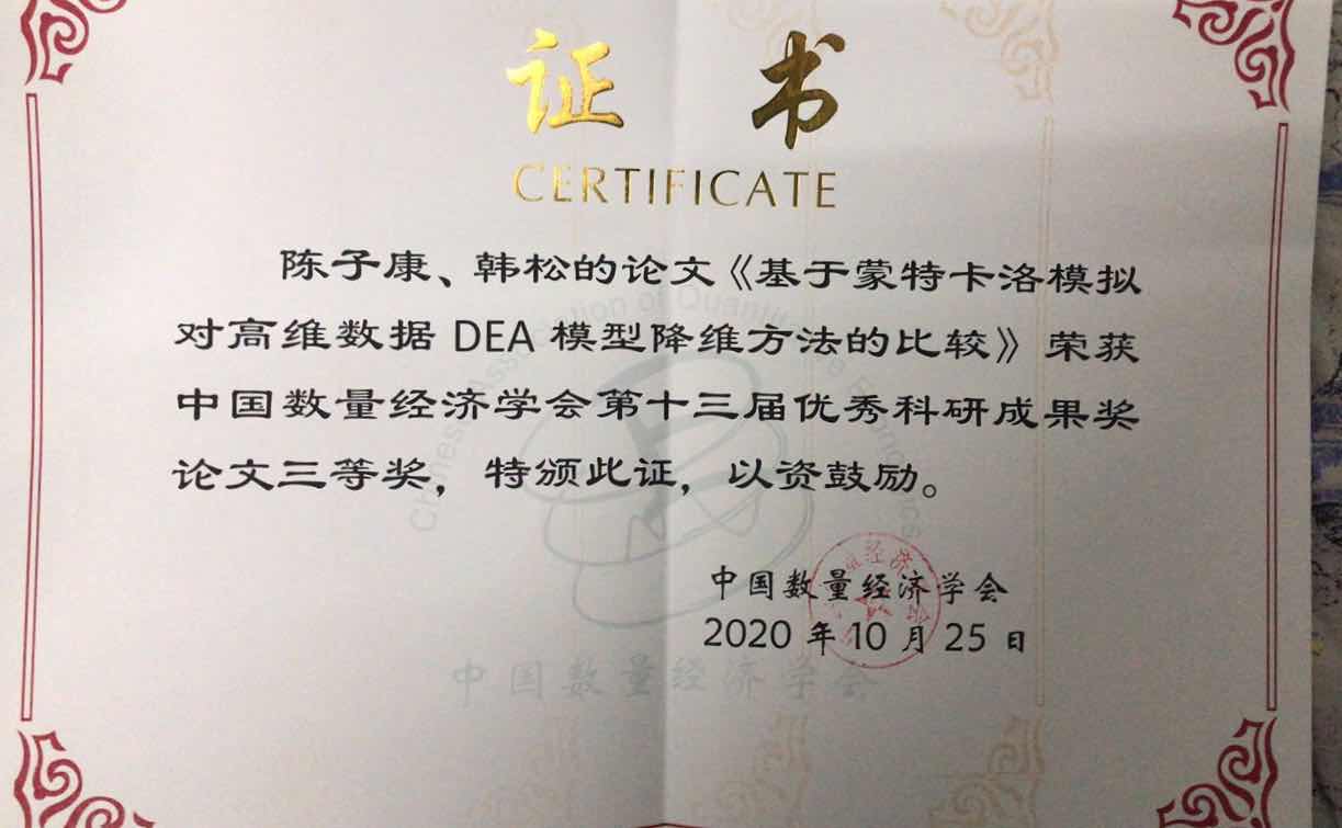 2020年10月24日至25日,中国数量经济学会2020(深圳)年会顺利召开。威尼斯9499登录数量经济学教研室韩松教授应邀带领其研究团队参加了会议。24日下午,韩松教授指导的博士生王洺硕在区域经济、产业经济专题论坛报告了合作论文《互联网与研发创新融合、文化产业全要素生产率》,韩松教授指导的硕士生陈子康在大数据理论与方法专题论坛报告了合作论文《基于蒙特卡洛模拟对高维数据DEA模型降维方法的比较》,并获得优秀科研成果论文三等奖。