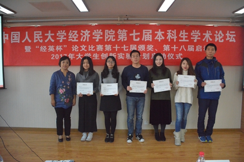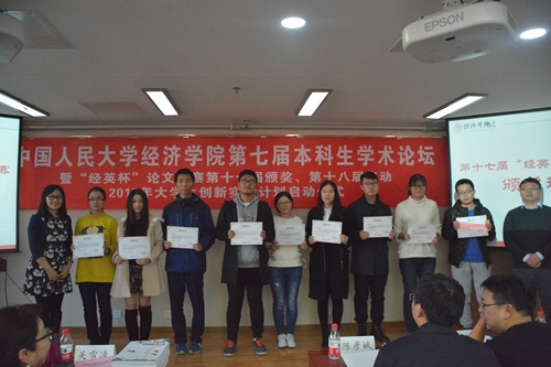 随后,陈彦斌教授、程大为教授、赵峰副教授、齐昊老师、黄滢老师和李佩洁老师分别为第十七届“经英杯”论文比赛特等奖、一等奖、二等奖、三等奖及鼓励奖获得者颁奖。关雪凌教授为2017年大创院级立项小组颁发了立项证书。