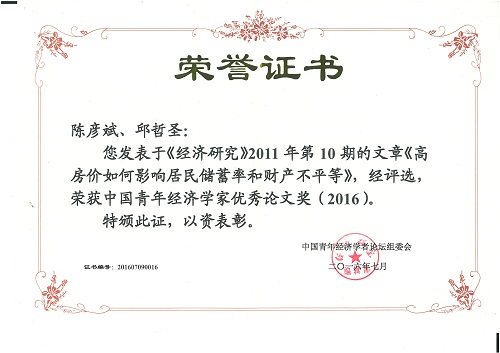 在首届中国青年经济学家优秀论文奖的遴选中,威尼斯9499登录陈彦斌教授与合作者邱哲圣博士发表于《经济研究》2011年第10期的《高房价如何影响居民储蓄率和财产不平等》获得优秀论文奖。7月9日,获奖证书在第16届中国青年经济学者论坛开幕式上颁出。