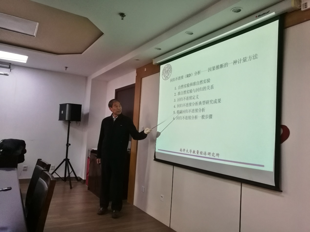 研讨会开始,张晓峒教授首先介绍到,回归不连续模型(RD)为计量经济模型中因果推断模型的一种。经济领域的因果推断,由于一些条件的限制难以达到“准自然实验”的条件,只能力争最大限度地做到随机选择实验对象以及最大限度平衡实验个体的异质性。具体从模型来说,潜在结果模型可以度量因果效应,当满足一定的条件时,因果效应存在会使回归直线出现中断,回归不连续(Regression Discontinuity)因此得名。张教授认为Regression Discontinuity翻译为“回归不连续”比“断点回归”更加准确,一是强调了因果分析,二是可以与“截断回归”区分开来。用回归不连续进行政策效应评估时,可以使用精确回归不连续分析回归方程,张教授指出回归不连续分析的设计是存在缺陷的,如其他控制变量的“中断”现象,研究对象的异质性以及很难推广到整体。之后,张教授以“非典事件是否给中国旅游人数序列造成冲击?”、“美国满21岁才可合法饮酒法律是导致21岁生日日死亡人数大幅增加的原因吗?”、“小班上课对教学效果有提高吗?”以及“三年经济困难给中国年增人口序列造成严重冲击了吗?”四个案例具体介绍了回归不连续的实际应用和分析解释。最后,张教授介绍了回归不连续分析的一般步骤,即画实验结果Y与分组变量X的散点图观察是否发生跳跃、画实验结果Y的频数分布图观察是否发生截断,但这两种方法均需注意区分图像为回归不连续还是logistic分布,另外,也可以用Y对常数项、处理变量D、分组变量X、处理变量和分组变量的交互项以及他们的高次项回归来判断是否存在回归不连续。