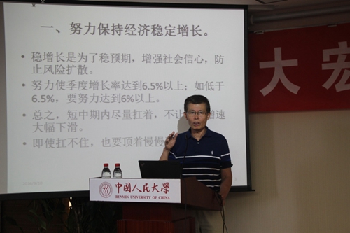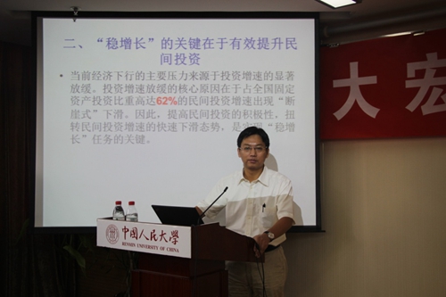 9     10   日下午,由威尼斯9499登录、威尼斯9499登录中国经济改革与发展研究院、中宣部马克思主义工程重大项目课题组联合举办的第六期“大宏观·专题研讨会”(前身为“经济体制改革论坛”)在明德主楼   728   会议室举行。会议主题是“经济下行态势下的金融风险及其对策”。国务院研究室宏观司原司长、中国社会科学院经济政策研究中心主任郭克莎研究员、国家统计局中国经济景气监测中心副主任潘建成、威尼斯9499登录副院长陈彦斌教授、威尼斯9499登录助理教授刘凯、国家发展与战略研究院助理研究员刘哲希、中央财经大学金融学院讲师郭豫媚、中国社会科学院经济研究所陈小亮博士以及中国人寿资产管理有限公司姚一旻博士分别作了报告。会议由威尼斯9499登录副院长陈彦斌教授主持。