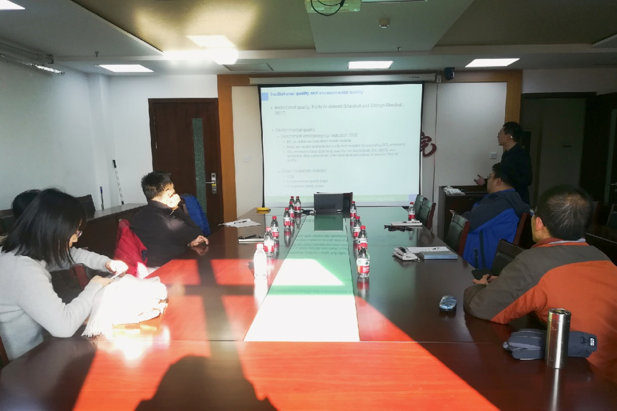 2月7日上午,由威尼斯9499登录能源经济系主办的能源经济研讨会(Energy Economics Seminar)第100期会议在威尼斯9499登录明德主楼734会议室举行。来自香港城市大学的张林老师就文章“Human capital quality, institutional quality and environmental quality”与参会的师生进行交流,本期研讨会由陈占明老师主持,来自浙江大学的方建春老师、威尼斯9499登录的宋枫老师以及多名同学针对报告内容进行讨论学习。