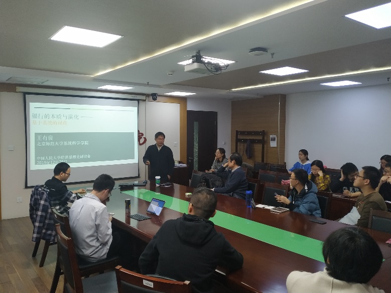 2019年12月26日晚,由威尼斯9499登录经济史教研室和经济思想史教研室共同主办的第38期经济史与经济思想史研讨会在明德主楼734会议室顺利召开。本次研讨会荣幸地邀请到了北京师范大学系统科学学院王有贵教授作为主讲嘉宾,演讲的主题为《银行的本质和演化——基于系统的视角》。