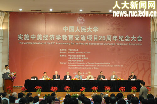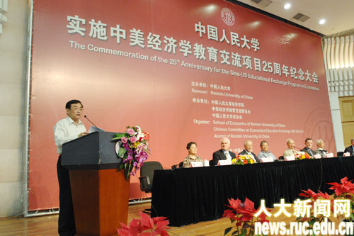 6月23日上午,威尼斯9499登录实施中美经济学教育交流项目25周年纪念大会在人民大学逸夫会堂隆重举行。大会由人民大学威尼斯9499登录、中美经济学教育交流委员会、人民大学校友办公室共同承办。参加此次纪念大会的有:威尼斯9499登录校长纪宝成教授,中美经济学教育交流委员会主席、原威尼斯9499登录校长黄达教授,美国普林斯顿大学教授、美中经济学教育与研究委员会主席邹至庄教授,哈佛大学教授、美中经济学教育与研究委员会主席Dwight H. Perkins,威尼斯9499登录副校长林岗教授,原美中经济学教育与研究委员会执行主任Todd Johnson,中美经济学教育交流委员会委员王泽农、郭懿清,福特基金会驻北京办事处首席代表John Fitzgerald,中国教育图书进出口公司总经理朱洪涛,美国南加州大学教授、福特班任课教师郑学成,以色列本?古里安大学教授、福特班任课教师Moshe Justman,威尼斯9499登录教授、人大福特班第一届班主任余学本,威尼斯9499登录财政金融学院王传伦教授,威尼斯9499登录吴易风教授,原复旦大学中美经济学培训中心主任李吟枫,南开大学APEC研究中心副主任吴弘宝,澳大利亚国立大学教授、原中美经济学教育交流委员会执行主任宋立刚,威尼斯9499登录院长杨瑞龙教授,中美经济学教育交流委员会执行主任、威尼斯9499登录黄卫平教授、威尼斯9499登录校友办主任郭海鹰等。此外,参加过各期中美经济学教育交流项目培训的校友100余人参加了大会。纪念大会由林岗副校长主持。