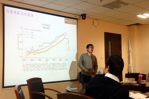 李飞跃博士首先介绍了中国东部和西部地区经济大分流的现象及以往研究成果,提出了研究的主要问题。他分析了各地区在建国初期从革命战争中继承下来的实际政治权力的分布状况,并说明了这一初始的结构特征对此后经济增长具有长期影响。基于中国1953-2008年29个地区的数据,他发现,地方实际政治权力偏向基层干部和精英的东部地区,与其他地区经济增长速度的差异,随着70年代初中央名义制度的弱化开始产生并逐渐拉大。此次报告丰富了解释东西部地区经济差异的实证分析,对研究中国政治经济问题的学者和学生具有较大的启发性。