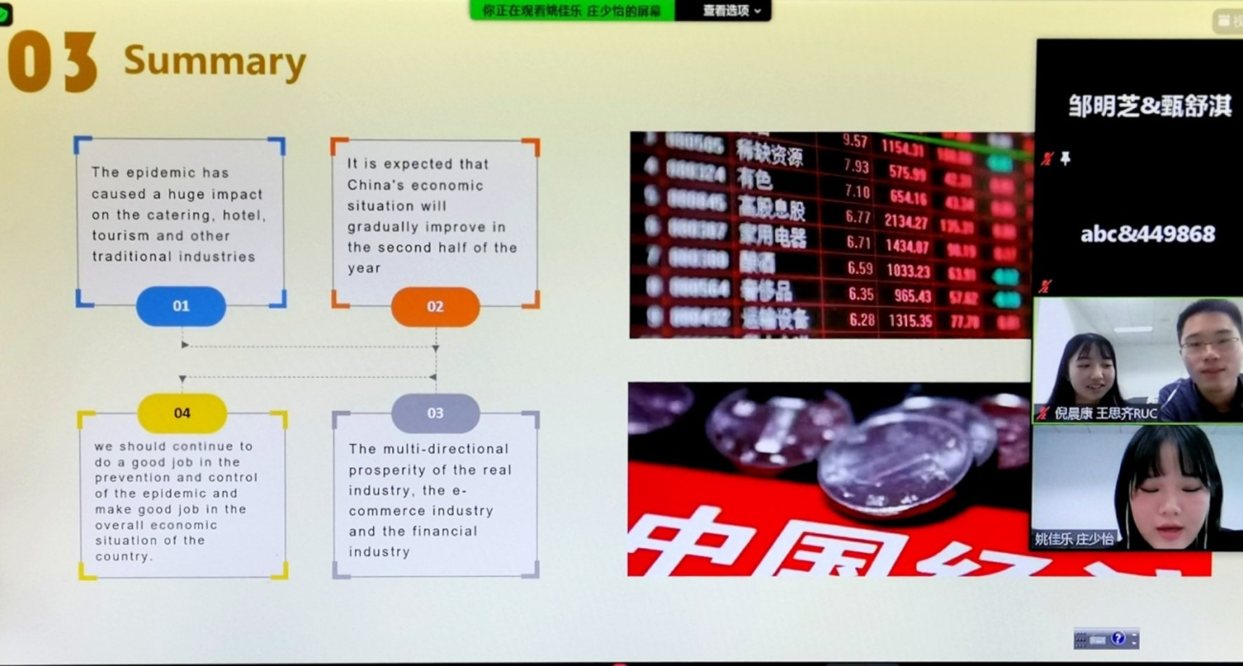 首先由日本一桥大学的学生进行展示,经济学部2级学生陈天天展示了其小组对“新冠疫情对中国经济的影响”这一课题的研究。他重点分析中国的工业及零售业如何在疫情期间受到冲击及顺势转型,结合了“全时”及“盒马鲜生”等具体案例进行讲解。最终,他认为在疫情冲击下,中国的零售业正加速发生结构性转变,零售业与互联网的结合将更加紧密。