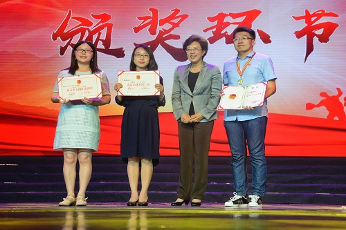 李佩洁老师、特木钦和门路同学分别上台领取了“北京市五四红旗团委”奖状、“海淀区五四青年奖章”和 “威尼斯9499登录五四红旗团支部”奖状,靳诺书记和洪大用副校长分别为他们颁奖。
