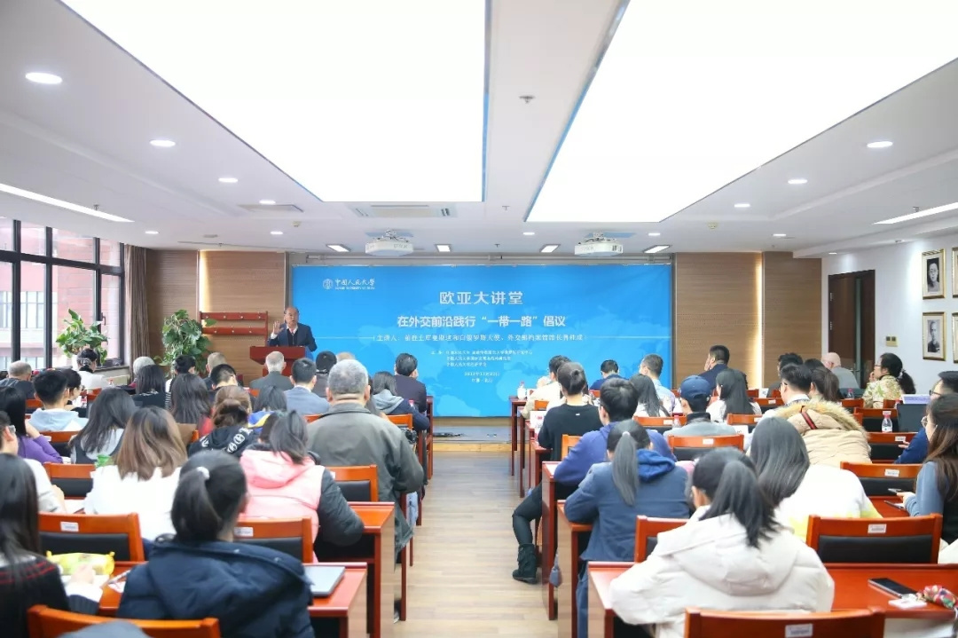会见后,鲁桂成大使作为欧亚大讲堂嘉宾,为我校师生作了题为在外交前沿践行一带一路倡议的演讲。