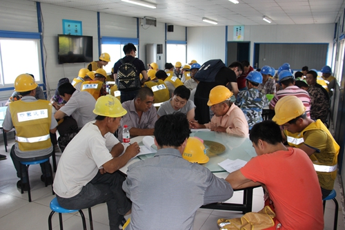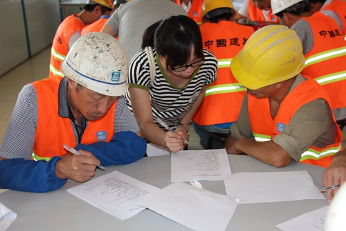 在人物访谈的同时,问卷调查也在井然有序地进行。问卷调查分两小组,每组六七位同学,分别由田超伟、陶雨铎带队,在会客室、食堂两个场地同时进行。每小组上午、下午各做一轮问卷调查,每轮调查50至60位农民工,共发放和收回约210份问卷。每份问卷包括六大板块,即“个人及家庭基本情况”、“就业与权益”、“能力与发展”、“生活与健康”、“社会关系与社会参与”、“老家的生活状况”等,共有约80个相关问题。作为问卷调查对象的农民工师傅们来自不同的项目工程部,从事多种工种,包括电工、木工、油漆工以及水泥工等等。其中,绝大多数为男性农民工,也有少数女性农民工从事建筑业。工人师傅们都非常配合,积极填写问卷。针对问卷内容,国情考察团小组成员们纷纷热情地为工人师傅们解疑释惑;遇到不识字的或识字少的工人师傅,组员们耐心地进行“一对一”指导,念题、解释,代为填写问卷。通过问卷填写和与工人师傅们的面对面交流,我们发现:农民工师傅们在建筑工地上劳动时间长、强度大,非常辛苦;虽然工资水平提高了,生产生活条件改善了,但是社会保障不足、劳动合同签订率低、工资延发、文化娱乐生活匮乏等问题仍较突出,多维贫困状况有待改善。